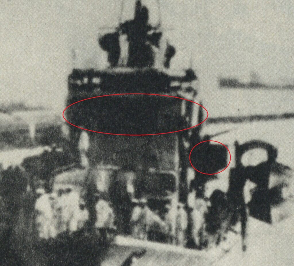 よって、航泊日誌に記載されている9月13日に装着された防弾板は機銃台へ装着されたものと考えられ、それが写真9で確認できます。やや不鮮明ですが、この時羅針艦橋にも防弾板が装着されていたと考えられます。